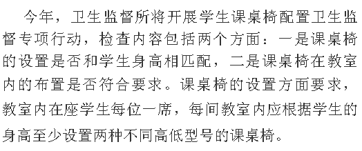 青少年處于快速生長(zhǎng)階段,身高變化快,學(xué)校應(yīng)該每學(xué)年按照學(xué)生身高配備適宜的課桌椅,且盡可能做到同號(hào)課桌椅配套使用,對(duì)較胖的學(xué)生,可按學(xué)生身高確定合適的課椅型號(hào),再由課椅型號(hào)向上選擇較大一型號(hào)的課桌。